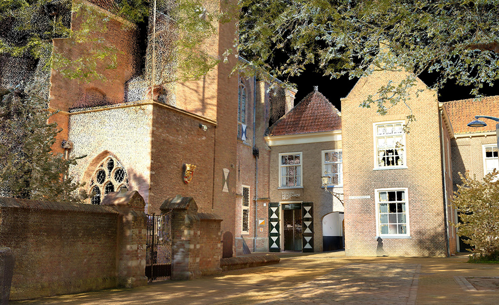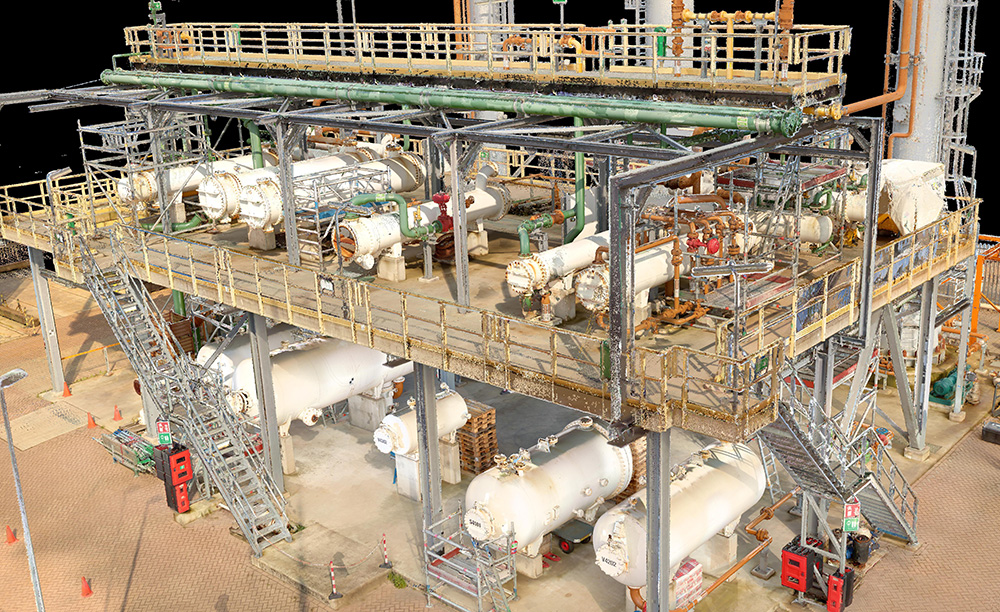 2024年に登場した「NavVis MLX」は、より軽量で取り回しやすいハンディ型の3Dレーザースキャナだ。重量約3.6kgとVLX3の半分以下でありながら、VLX3同等の相対精度±5mmを維持している。「MLXの最大の魅力は機動性です」と高根氏は語る。「配管などの複雑な形状が多い施設、狭い場所や高所、設備の下部など、VLXでは計測困難な箇所にも容易にスキャンできます。ハーネスで体に固定でき、長時間の計測でも疲れにくい設計になっています」。MLXにもVLX3同様にディスプレイが搭載され、データの取得レベルや計測経路をリアルタイムで確認可能だ。前後左右4台のカメラが撮影姿勢に応じて270°モードと360°モードを自動切り替えし、ストリートビューのような映像生成と点群データへの鮮明な色付けを実現する。VLX3より価格は手頃で、「建設現場での日々の施工状況把握や、設備改修後のデータ更新などに最適です」と高根氏は用途を説明する。具体的な成果として、従来は1週間かかっていた測量作業が1日で完了し、しかもより高精度で網羅的なデータが得られるケースが多数報告されているという。