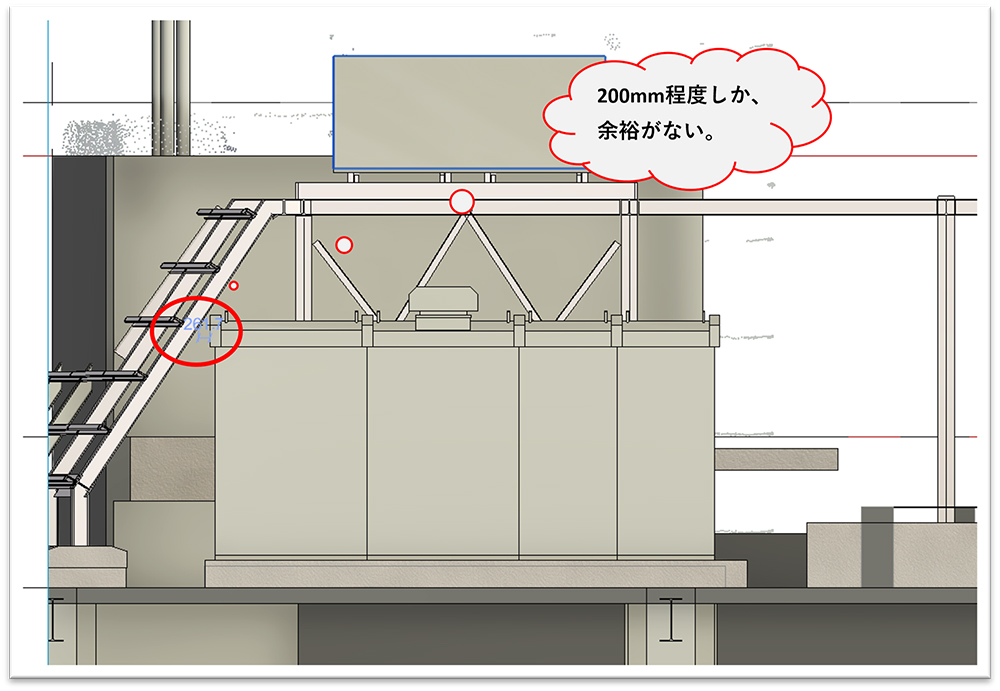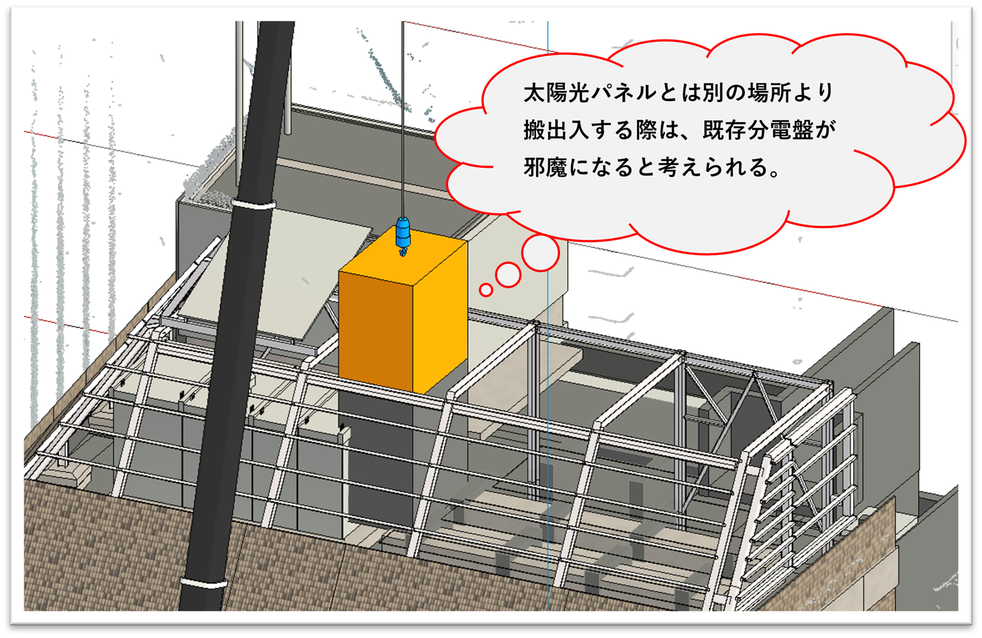 導入直後から成果が現れたのが、東京・銀座にある同社本社ビルでのキュービクル改修工事だった。この工事では、大型のキュービクルを屋上に搬入する必要があったが、現場周辺は繁華街特有の狭隘な道路環境であり、搬入ルートの確保に難航しそうな状況であった。さらに屋上は鉄骨で組まれた目隠しで囲まれ、太陽光パネルも設置されていた。2Dの検討では読み切れない課題が、山積していたのである。村井氏は「断面で見ると200mm程度の余裕しかない箇所もあり、非常に繊細な検討が必要でした」と語る。従来であれば現場で実物を持ち込んでから初めて干渉に気づく可能性もあり、安全性と効率性の両立が大きな懸念となっていた。