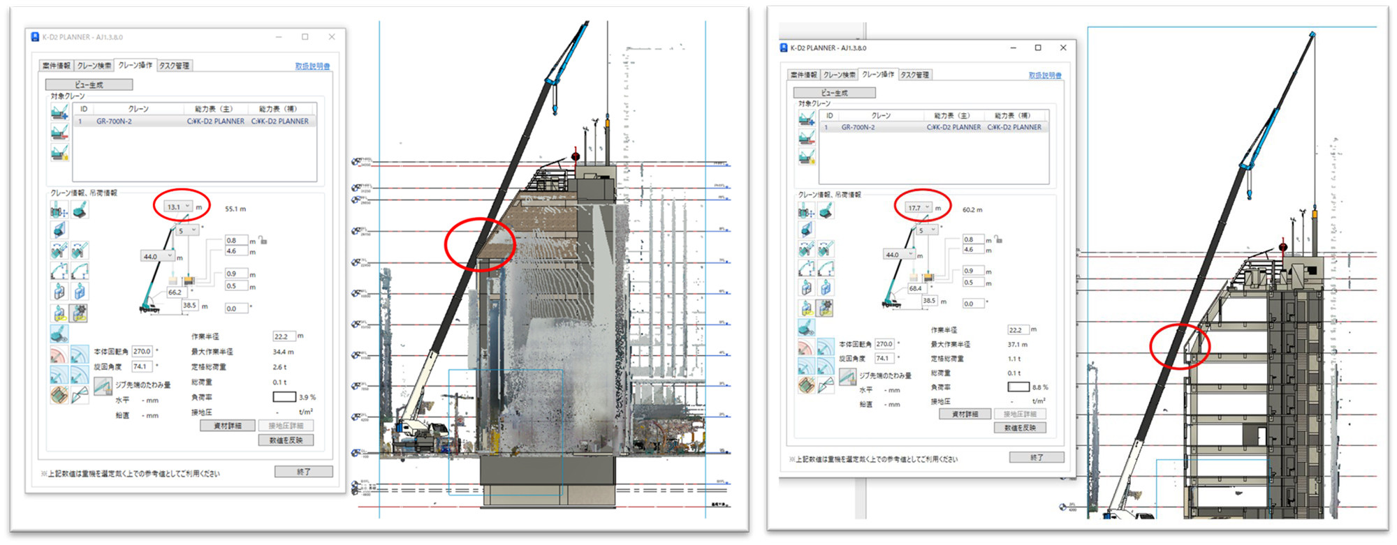 そこで屋上と周辺の道路上空にある信号機や看板などの点群データを取得した上で、K-D2 PLANNERを活用しBIMモデルと統合した詳細なクレーンシミュレーションを実施。クレーンの配置位置、またブームの長さや角度、旋回動作を繰り返し検証することで、干渉を避けるために太陽光パネルを撤去しなければならないことなどが事前に明らかになった。「これまでであれば当日になってようやく判断できた課題が、事前に細かく把握できました。その結果、7時間を見込んでいた作業を、わずか3時間半で完了できたのです」と村井氏は振り返る。