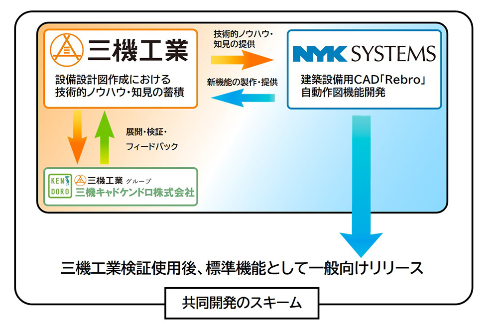 この自動作図機能を実現するため、両社の共同開発が2024年12月からスタートした。三機工業の設備設計図面作成に関する豊富なノウハウと、NYKシステムズの開発力を融合させる取り組みである。