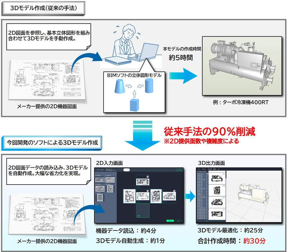 加えて、三機工業が独自開発した2D図面から3Dモデルを自動生成するソフトウェア「TRANDIM™」との連携により、建築設備BIMの新たな段階が見えてきた。