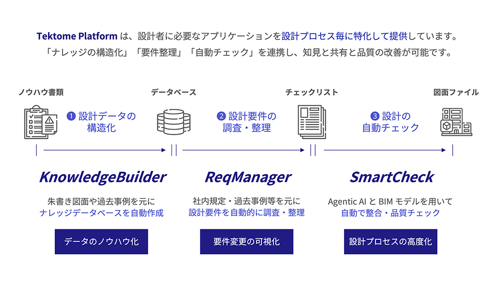 そのビジョンの実現に向け、同社が提供しているのが、「Tektome Platform」だ。クラウドベースのプラットフォームで、建築プロジェクトに関わる多様な情報をAIが自動的に整理・蓄積し、良質な建築統合データベースを構築。そのデータベースを様々な設計業務に活用することで、同社の自動設計や自動検図などさまざまなアプリケーション上での活用を可能にする。