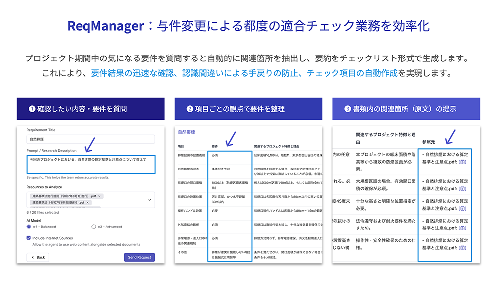 2つ目の「ReqManager」は、社内の要件、過去の事故や失敗事例、そして施主や設計に関する要件の一元管理を可能とするもの。AIが各要件を自動整理するため、法規・技術基準や要件、議事録など、プロジェクト関連文書から重要な情報を自動で抽出することが可能だ。