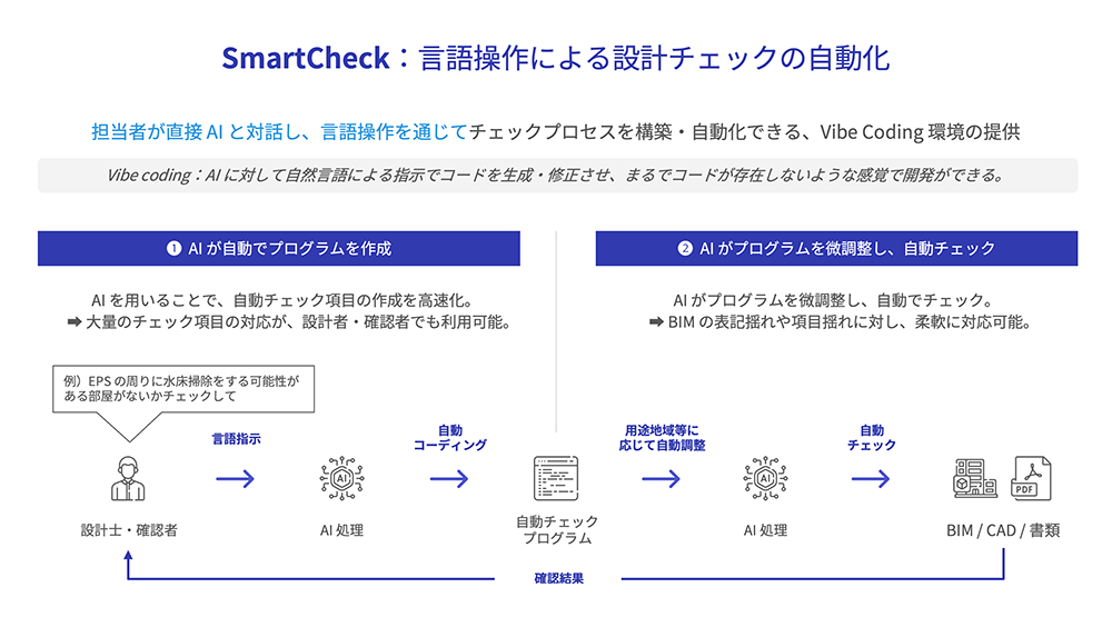 「SmartCheck」は、前述のReqManagerでまとめた内容をAIがBIMのデータや図面の品質チェックを行ってくれる。ユーザーは、直接AIと対話し、言語操作を通じてチェックプロセスを構築・自動化できる。「例えば、前述のReqManagerですでに自然排煙の要件がまとまっているとします。その上で、防煙区画は500㎡以内ごとに形成し、排煙口は区画内の各部まで水平距離30m以内の位置に設置、排煙口の有効開口面積は区画面積の1/50以上とする必要がある場合、SmartCheck を使えばAIがBIMデータを自動チェックして、BIMデータのOK箇所とNG箇所をレビューしてくれるのです」。